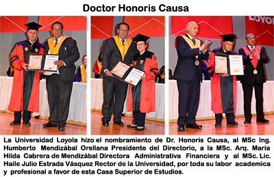 En el contexto de estos actos, la Universidad Loyola hizo un reconocimiento especial y merecido al Ing. Humberto Mendizábal Orellana y a la Arq. María Hilda Cabrera de Mendizábal, otorgándoles el Título de Doctor Honoris Causa, por toda su labor, en la construcción de la Universidad Loyola y en reconocimiento a su trayectoria profesional y académica.
