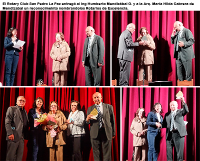 El Rotary Club San Pedro La Paz, se sumó a estos reconocimientos, nombrándolos Rotarios de Excelencia a la Arq. María Hilda Cabrera Mayser de Mendizábal y al Ing. Humberto Mendizábal Orellana, por su trayectoria al servicio de la comunidad.