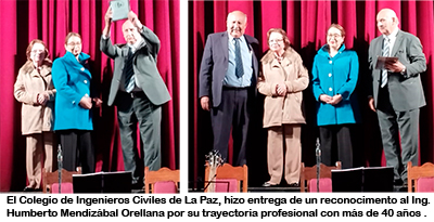Así mismo el Colegio de Ingenieros Civiles de La Paz, hizo entrega de un reconocimiento al Ing. Humberto Mendizábal Orellana por su aporte a la profesión con más de 40 años de praxis profesional.