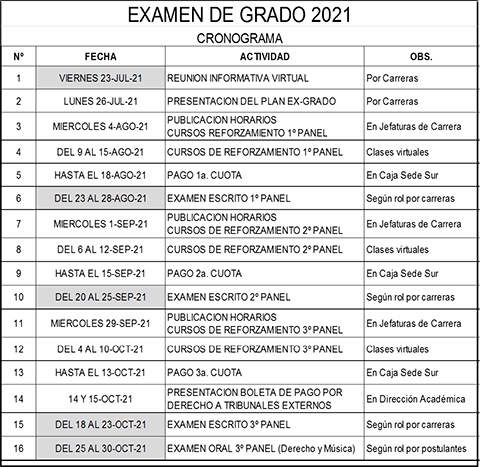 SE COMUNICA A LOS POSTULANTES DE LAS CARRERAS HABILITADAS AL EXAMEN DE GRADO QUE HA SIDO APROBADO EL CRONOGRAMA OFICIAL 2021.