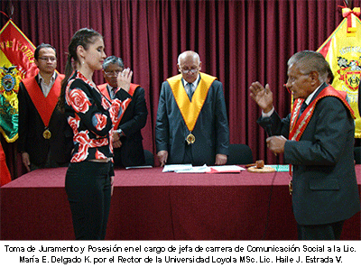 Ante la presencia de autoridades universitarias, jefes de carrera y personal administrativo, el Rector de la universidad MSc. Lic. Haile J. Estrada Vásquez tomó juramento y posesiono en su cargo a la flamante Jefe de Carrera Lic. María E. Delgado K., que a partir de la fecha tendrá en sus manos la conducción y rumbo de la carrera de Comunicación social.