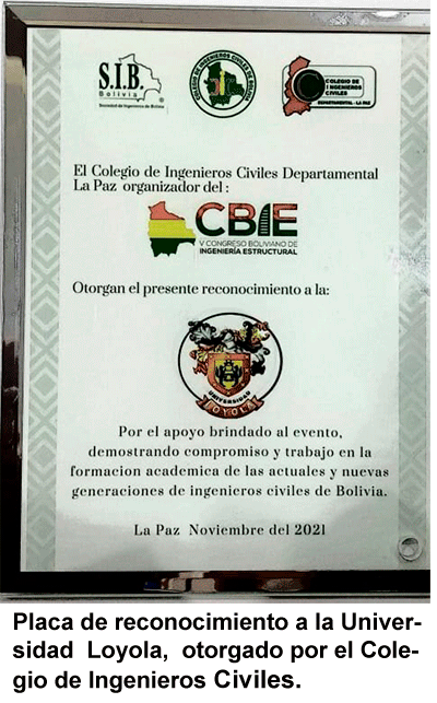 El Colegio de Ingenieros Civiles de La Paz, otorgo una placa de reconocimiento a la Universidad Loyola por el apoyo y compromiso brindado a esta institución en la realización del “V Congreso Boliviano de Ingeniería Estructural y Encuentro Académico de Ingenieros Civiles Nacionales e internaciones”, realizado los días 25, 26 y 27 de noviembre del presente en el Campo Ferial Chuquiago Marka.