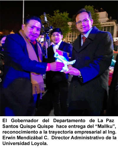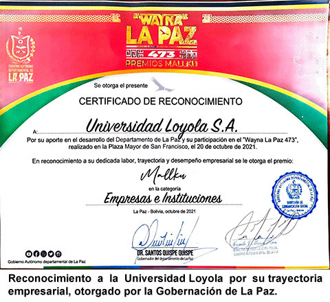 El Gobierno Autónomo de La Paz, conmemorando el 473 Aniversario de la Fundación de la ciudad de La Paz, entregó el Reconocimiento “Mallku”, en el Marco de Empresas e Instituciones de mayor relevancia de nuestra ciudad, a la Universidad Loyola.