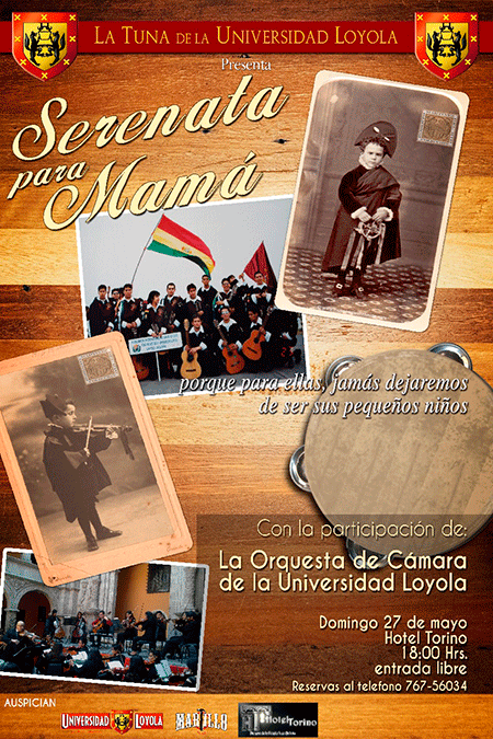 La Tuna de la Universidad Loyola y La Orquesta de Cámara de la Universidad Loyola,invitan a todas las mamás de la comunidad de Loyola y al público en general a la presentación que en Homenaje al Día de las Madres se realizará el día domingo 27 de mayo en el Hotel Torino (Calle Socabaya entre C. Potosí y C. Comercio) a Hrs. 18:00 (ingreso libre).