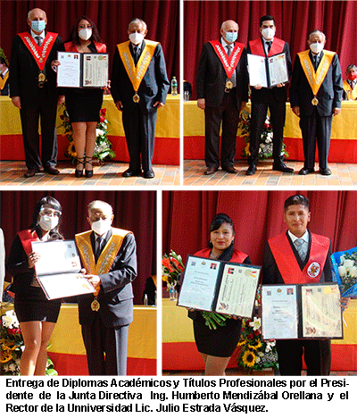 Recibieron sus Títulos Profesionales de manos del Presidente de la Junta Directiva Ing. Humberto Mendizábal Orellana y del Rector de la Universidad Lic. Julio Estrada Vásquez los graduados de las Carreras de: Ing. Agronómica, Ing. de Medio Ambiente, Ing. de Producción, Ing. Electrónica, Ing. Electromecánica, Auditoria, Administración de Empresas, Comunicación Social, Ing. Financiera, Ing. Mecánica, Derecho, Ing. Civil, Ing. Comercial, Ing. en Topografía, Medicina Veterinaria y Zootecnia y de Maestría.