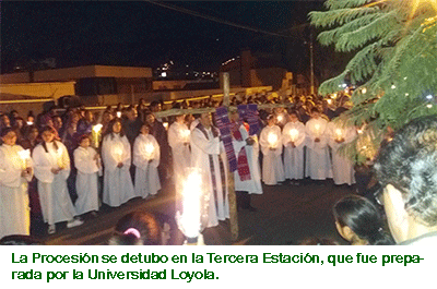A las 19:00 horas de ese día, se dio inicio a la procesión llegando al punto donde estaba la Universidad Loyola con sus autoridades y personal administrativo, fue un momento en el cual todos los participantes reflexionaron recordando el sufrimiento y padecimiento que vivió nuestro Señor Jesucristo durante su pasión y muerte por salvarnos del pecado, exhortándonos a enmendar errores cometidos y abrirnos a vivir en el amor de Cristo.